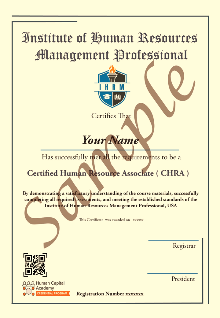 Course Objective | The Certified Human Resource Associate (CHRA) program is designed by the Institute of Human Resource Management (IHRM) to prepare aspiring and current HR professionals with a strong foundation in core human resource functions. The program takes a practical, globally aligned approach to developing HR capability across all key areas of people management. Through this certification, participants will gain essential knowledge and applied skills in Talent Acquisition, Compensation and Benefits, HR Compliance, and Employee Relations — enabling them to effectively support organizational goals and workforce development. The CHRA certification serves as a recognized credential for professionals seeking to build or advance their career in HR, ensuring competence, credibility, and confidence in managing the human side of business. |