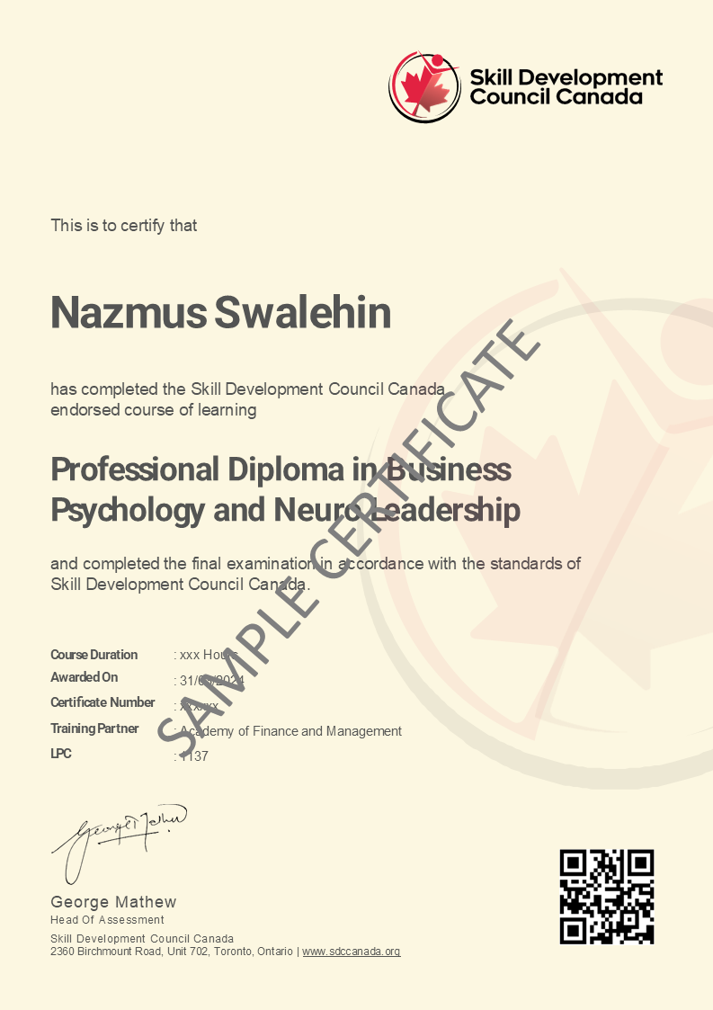 This course is accredited by the Skill Development Council Canada. After successful completion of the course, participants can obtain a Professional Diploma in Business Psychology and Neuro Leadership from SDCC.![]() | ![]() |