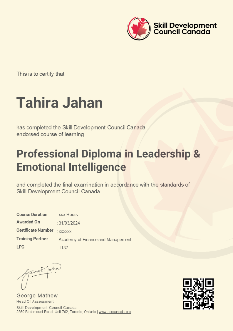| Benefits After Completion | After successfully completing the PDLEI, participants will get a certificate of Professional Diploma in Leadership & Emotional Intelligence from the prestigious Skill Development Council Canada |
