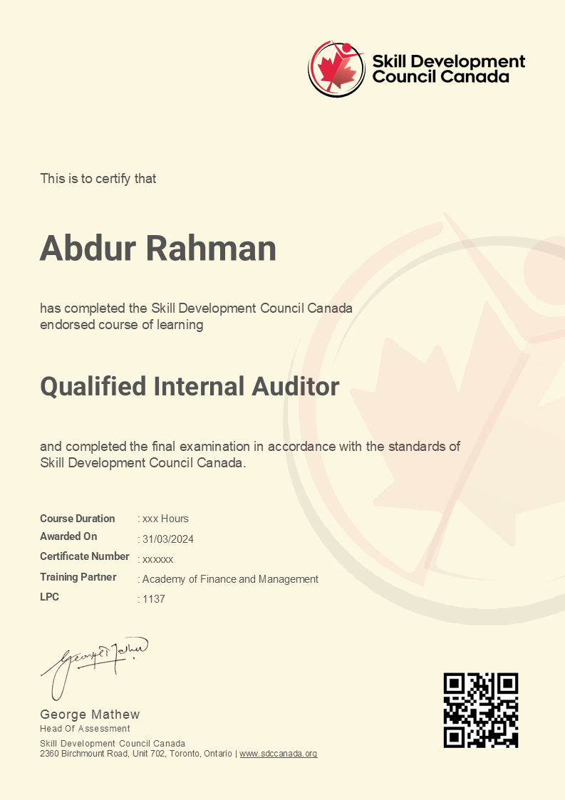 This course is accredited by the Skill Development Council Canada. After successful completion of the course, participants can obtain a Qualified Internal Auditor (QIA) from SDCC. | ![]() | ![]() |